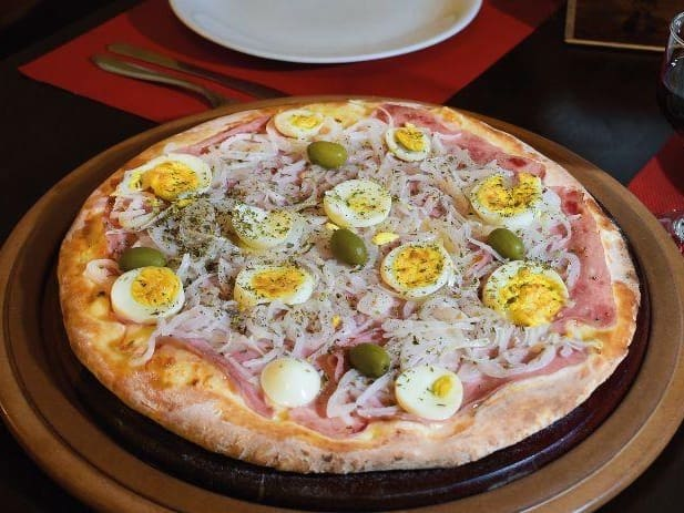 - Molho, mussarela, presunto, palmito, ervilha, ovo, azeitona e orégano.