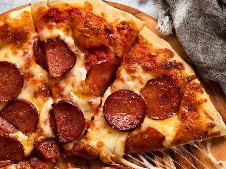 - Molho, mussarela, presunto, bacon, palmito, Catupiry, azeitona e orégano.