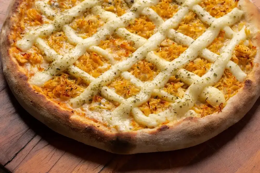 Pizza grande com 2 Sabores - 35cm - 8 pedaços Presunto e Mussarela: - Molho, presunto, mussarela, fatias de tomate fresco, azeitona e orégano. Bacon: - Molho, mussarela, bacon , Catupiry, azeitona e orégano. Clique e peça a sua!