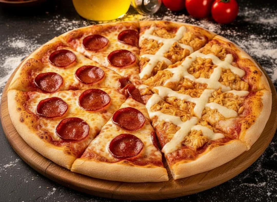 Pizza grande com 2 Sabores - 35cm - 8 pedaços Calabresa: - Molho, calabresa em fatias, mussarela, azeitona e orégano. Frango com bacon: - Molho, mussarela, frango, bacon, Catupiry , azeitona e orégano. Clique e peça a sua!