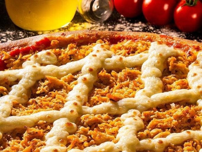 Pizza grande com 2 Sabores - 35cm - 8 pedaços Presunto e Mussarela: - Molho, presunto, mussarela, fatias de tomate fresco, azeitona e orégano. Bacon: - Molho, mussarela, bacon , Catupiry, azeitona e orégano. Clique e peça a sua!
